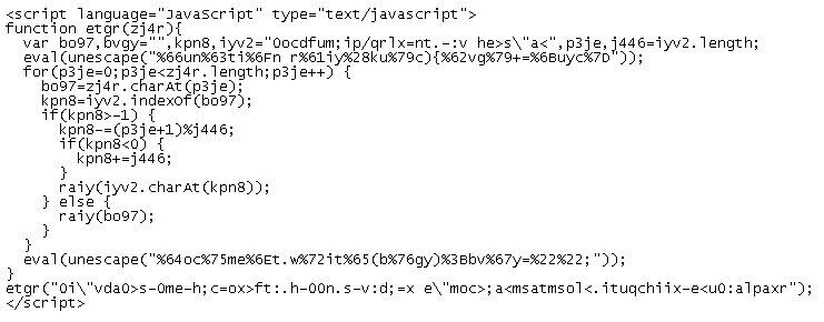 The top portion holds the algorithm that converts obfuscated text into the final code that will redirect the user to a malicious website. The last line of code just above the closing script tag is the obfuscated redirect code. I’ll walk through the de-obfuscation process then show you a quick way to obtain the final code.