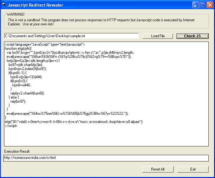 I’ve been working on a program that will help to reveal what these redirects are. It doesn’t de-obfuscate it in any way. Instead, it just runs the Javascript code and when the script tries to open a connection with a malicious website, my program grabs the HTTP request and tears the request down. There is no connection made to the malicious website so your computer is safe from the site.