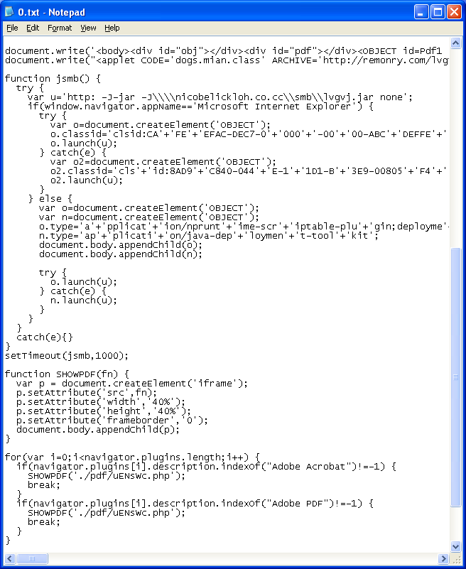 If we replace the eval line at the bottom with document.write(unescape(ret)). Now you can see both the Java and Acrobat exploits.