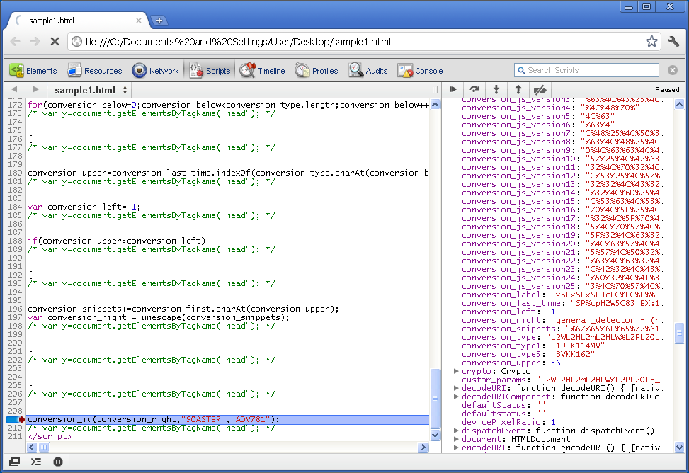 Chrome has a debugger and an array of other tools built right in. Chrome was quickly able to tackle all three scripts and produce the deobfuscated scripts. This tool is arguably the most robust and flexible of them all. You may need to read through the scripts to find out which variables to look out for.