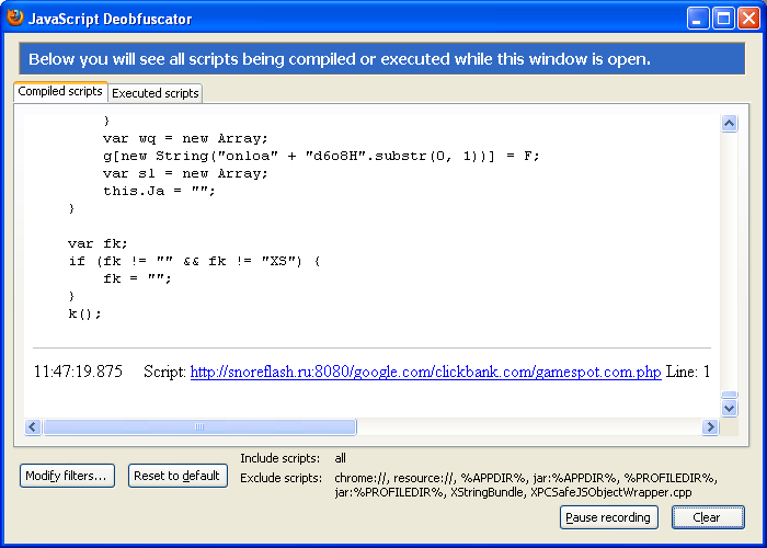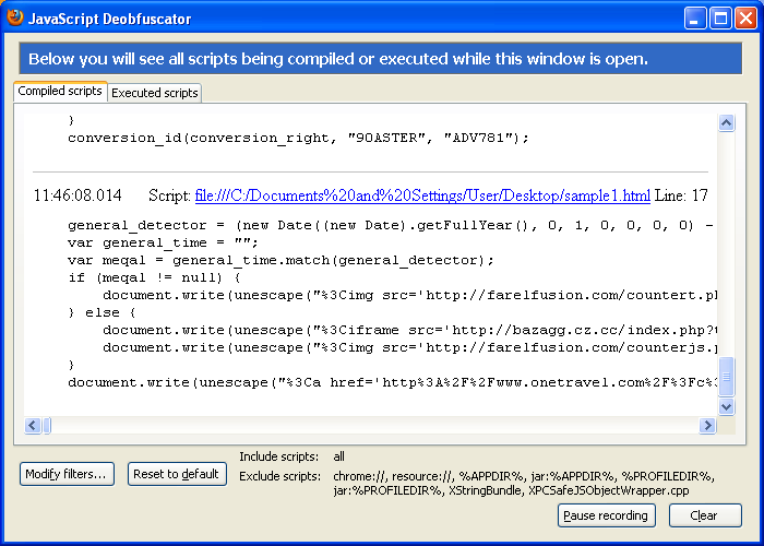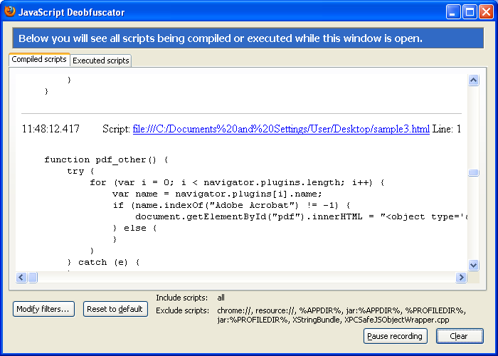 This plugin captures the scripts in its own window as Firefox executes them. This tool was the easiest to use because all you need to do is run this plug-in and hit the page with Javascripts on them. It was able to handle all three scripts without any user interaction (though it didn’t fully decrypt the second sample — only the URL was displayed).