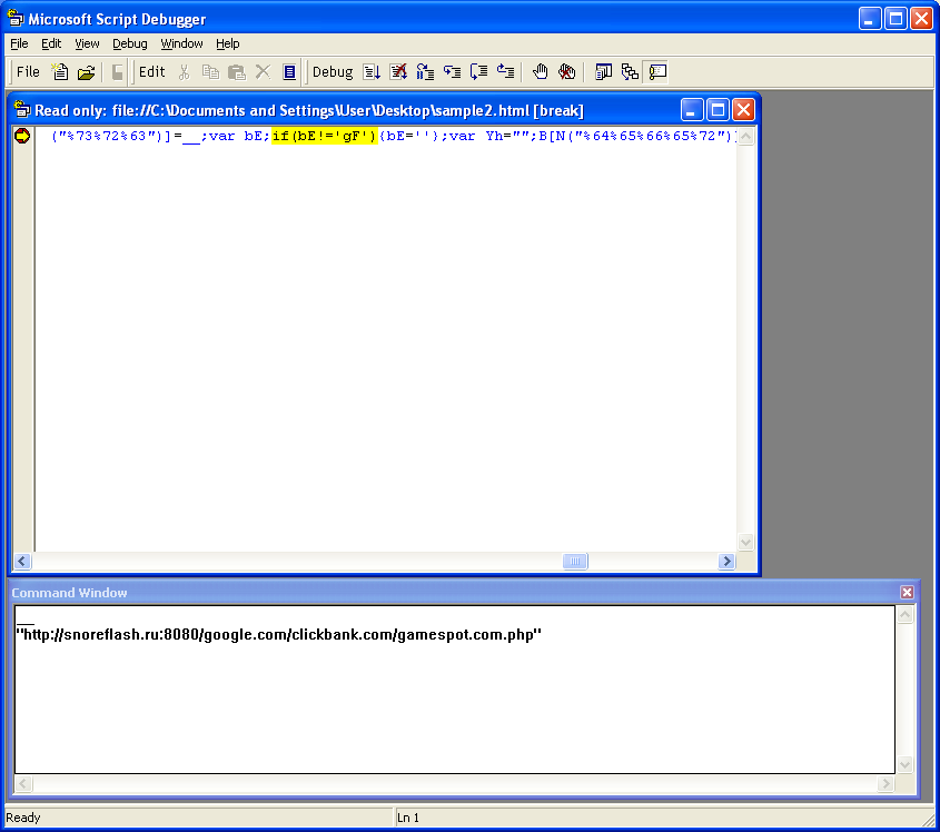 Finally, be on the look out for anti-debugging code such as the following example. This script will not give you a response if you step through the code. Of course they won’t be written this plainly and there’s dozens of different possibilities and methods.