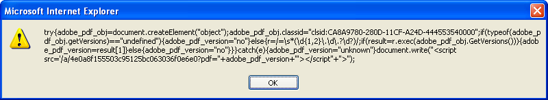 This calls up another webpage with a malicious PDF file. If the PC doesn’t have the right version installed then it shoots out another obfuscated Javascript that leads to a Java exploit.