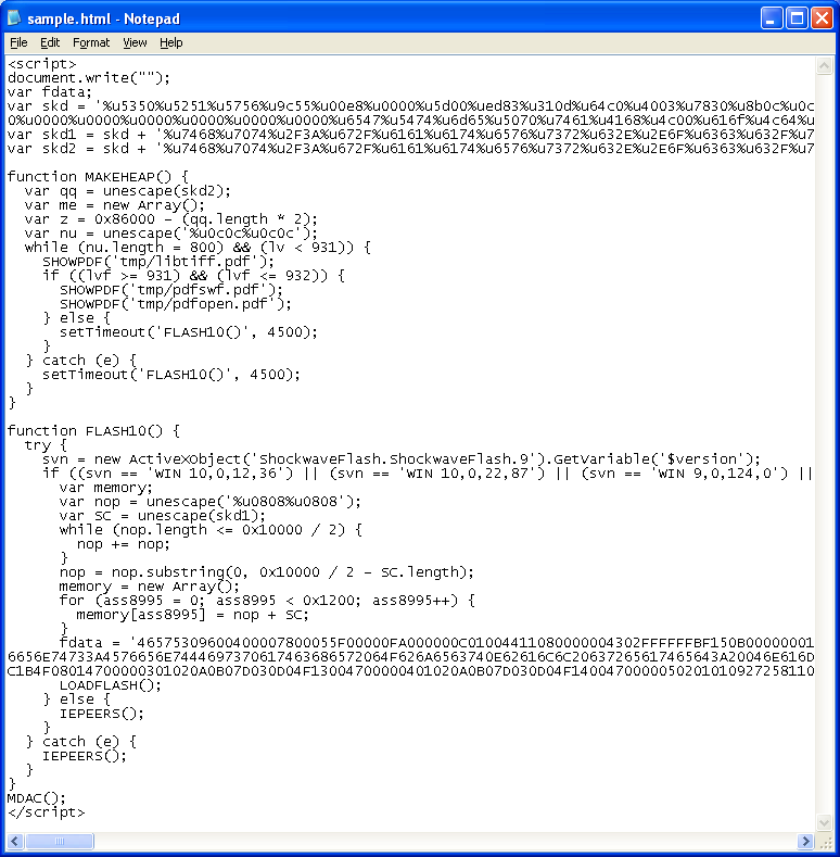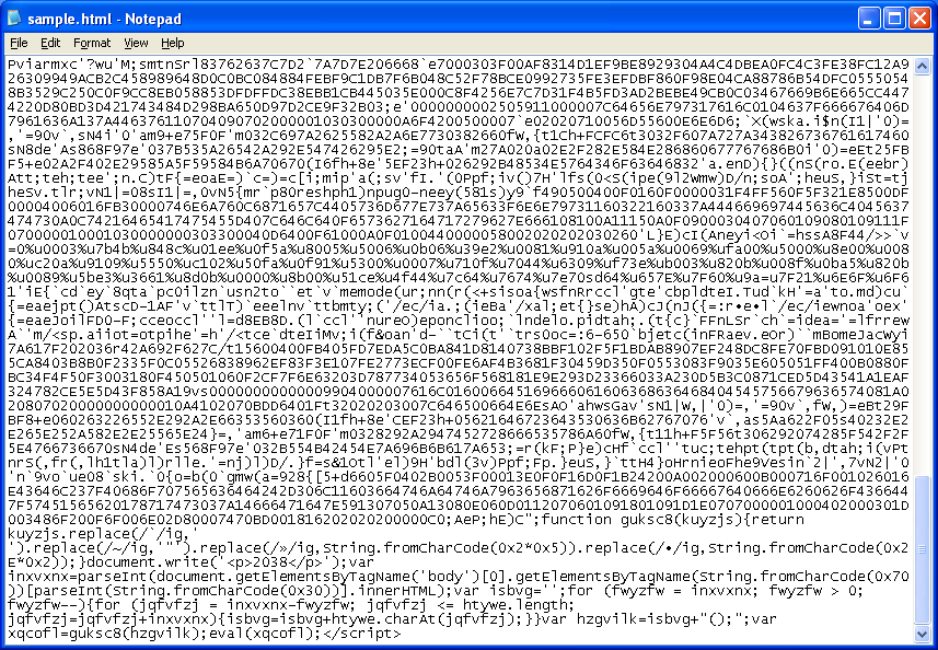 This is the Javascript you get when you visit one of its infected webpages. You can see the obfuscated gibberish at the top followed by the deobfuscation script at the bottom.