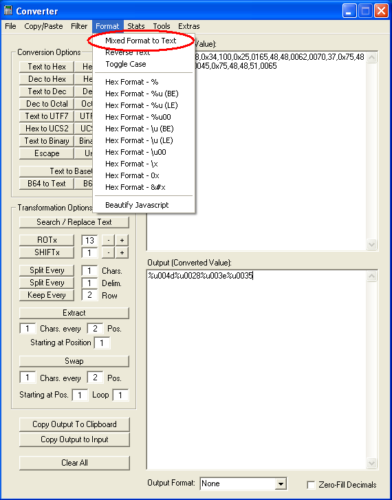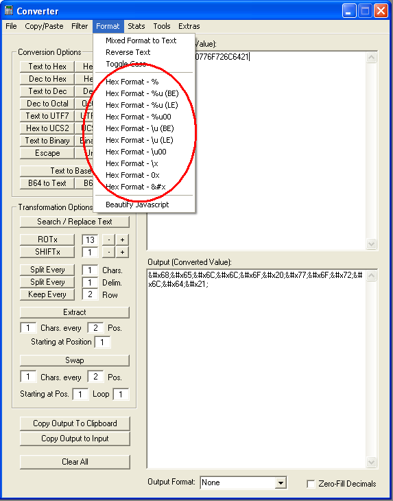 Many times you will encounter hex values in obfuscated Javascript. Now you can easily convert it one of several different formats. It will split every two characters and preceed them with the appropriate symbols. BE = Big Endian, LE = Little Endian.