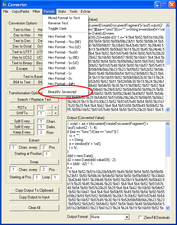 Instead of having to go to an online tool to make Javascript look pretty, I’ve added the code from JSBeautifier.org (credit to them). Since the limit of textboxes is 65K, don’t try to convert anything greater than that or it will truncate. This is meant for short scripts.