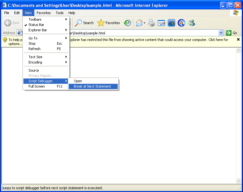 Launch IE and ensure you set the “Break at Next Statement” from the “Script Debugger” menu item before running the script.