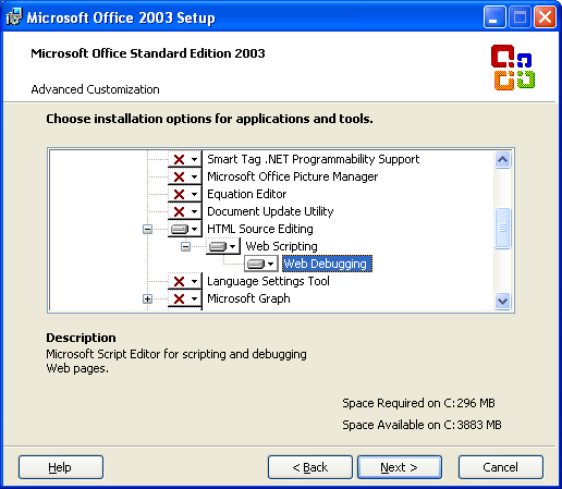 Let’s now have a look at Microsoft Script Editor. You need Microsoft Office 2003 (or 2000) but you don’t have to install the entire suite. Choose the custom install and disable everything except for the following: