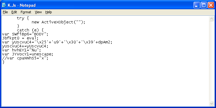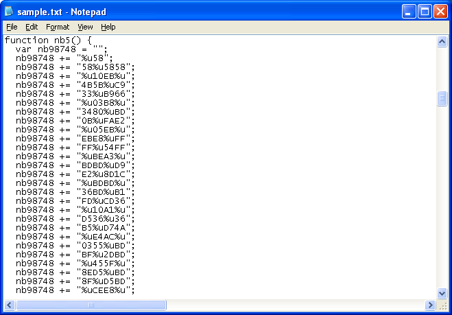 Here’s a portion of Javascript code for an exploit shared with me by fellow security researcher, Ben (thanks for the share!). You can see the NOP sled being setup in the “nb1” function. (There are several versions of this and are different in nature; one is an IE Behaviors exploit and another is the flash one…still need to research.)