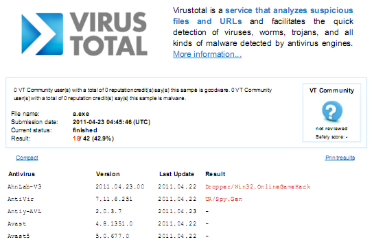 The resulting malware that gets installed on the unsuspecting victim’s PC looks to be some kind of game stealer and is detected by 18 of 42 anti-virus engines (42.9% coverage).