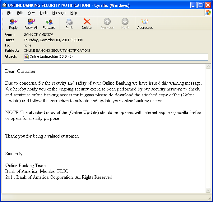 Phishing appears to be on the decline but some phishers aren’t stopping and have apparently changed some of their tactics. Instead of including a link in the email body, an HTML attachment is sent. The user is then enticed to open the attachment. I don’t know if this extra step hurts or helps the phishers but this changes things up a bit. This method is certainly not new but I’ve been seeing several of these come in lately and one of them took me by surprise.