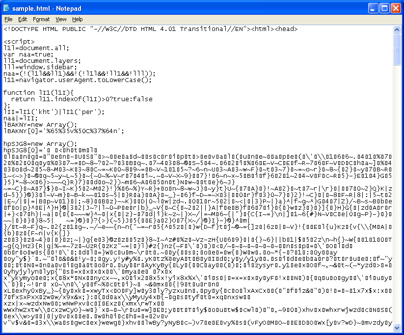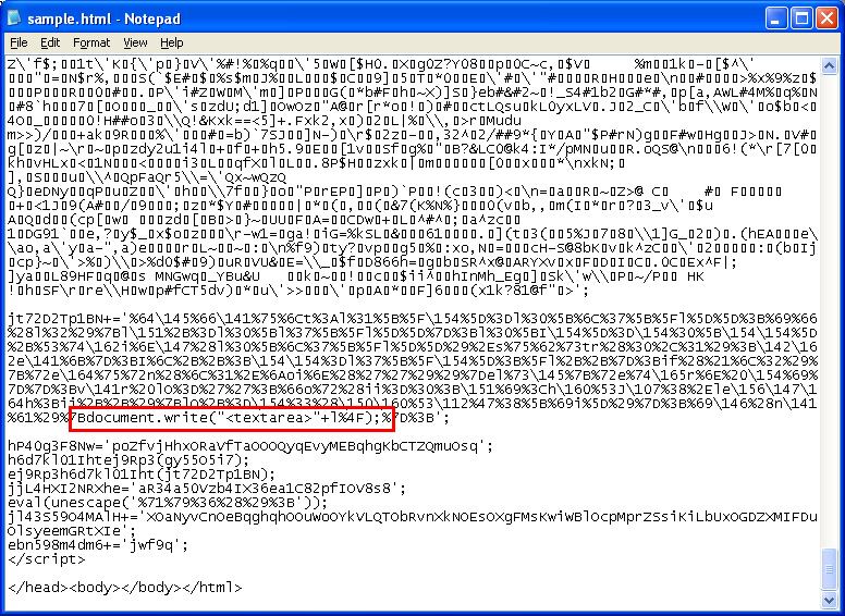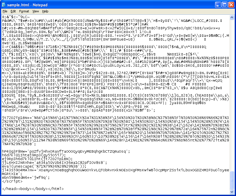 Whoa! Nice obfuscation there! Here’s a prettied-up version. If you look closely at the “hpSJG8” variable, you can just about make out the “html” tag with garbage characters in between.