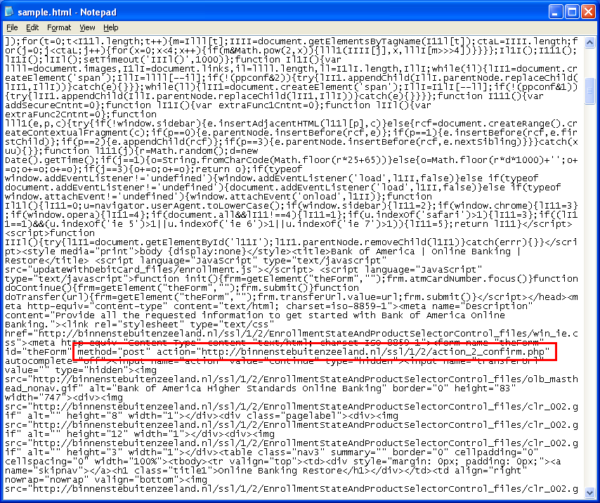 The author of the script created two layers of obfuscation so you have to decrypt the set of hex and octal characters you see at the “jt72D2Tp1BN” variable. You’ll find that this does the actual deobfuscation and then does a document.write to render the HTML form you saw earlier. Our hack involves redirecting the HTML code into a textarea box so we can see the code and not have it rendered.