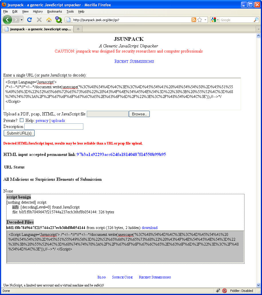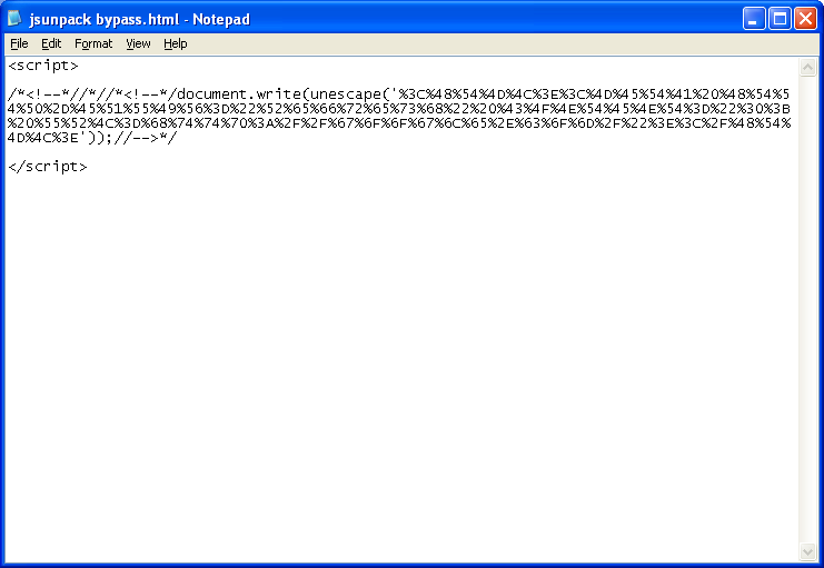 2. JSUnpack is a very good online tool that analyzes Javascript. I came up with several bypass methods some time ago and I’ll try to use the same techniques against my tool. Here’s one such method.