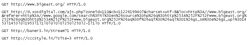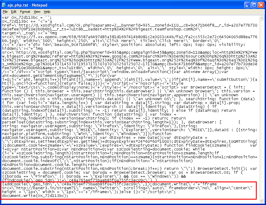 At the bottom, you’ll see obfuscated Javascript. Several redirectors and exploit packs are using this exact method so maybe there’s some code sharing going on.