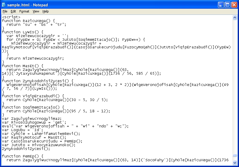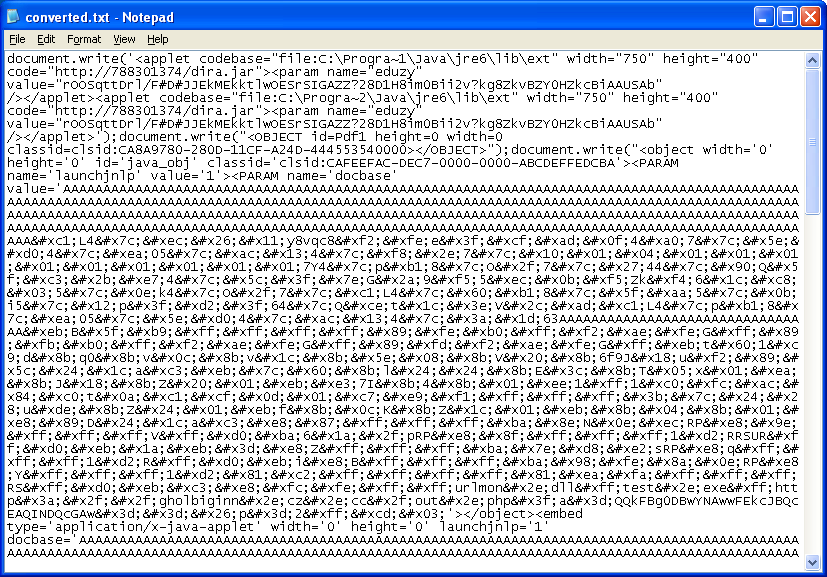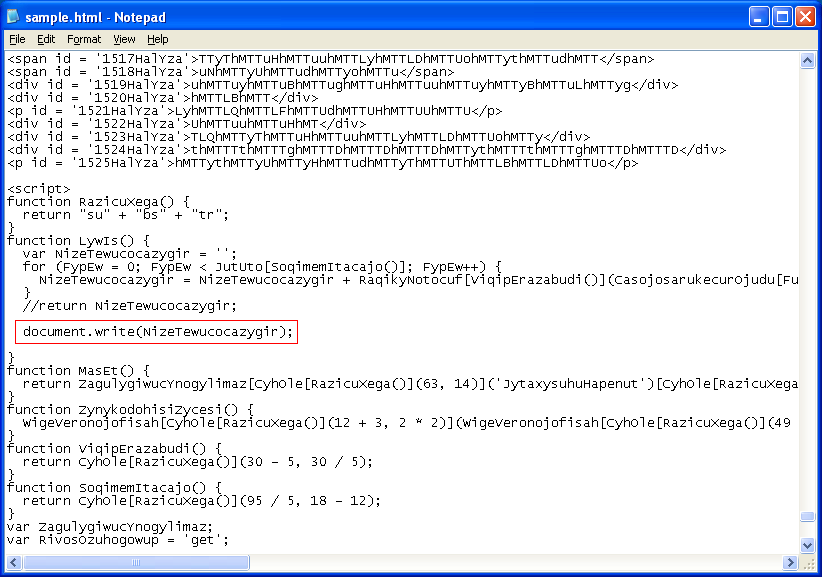 The result is 4. Remember that for later. After a bunch of concatenation, text replacements, and other steps to try and throw you off, the Javascript code takes the junk at the bottom and decrypts it. Here’s an excerpt of the gibberish: