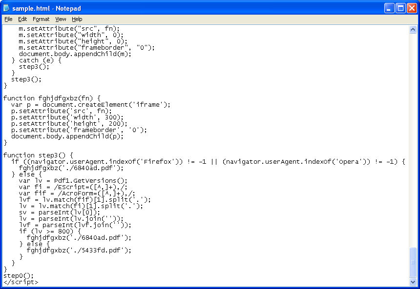 Each of these exploits are spread over four steps in the code we just deobfuscated. Let’s look at the last step, “step3”. This function pushes out one of two PDF exploit files depending on your browser/version.
