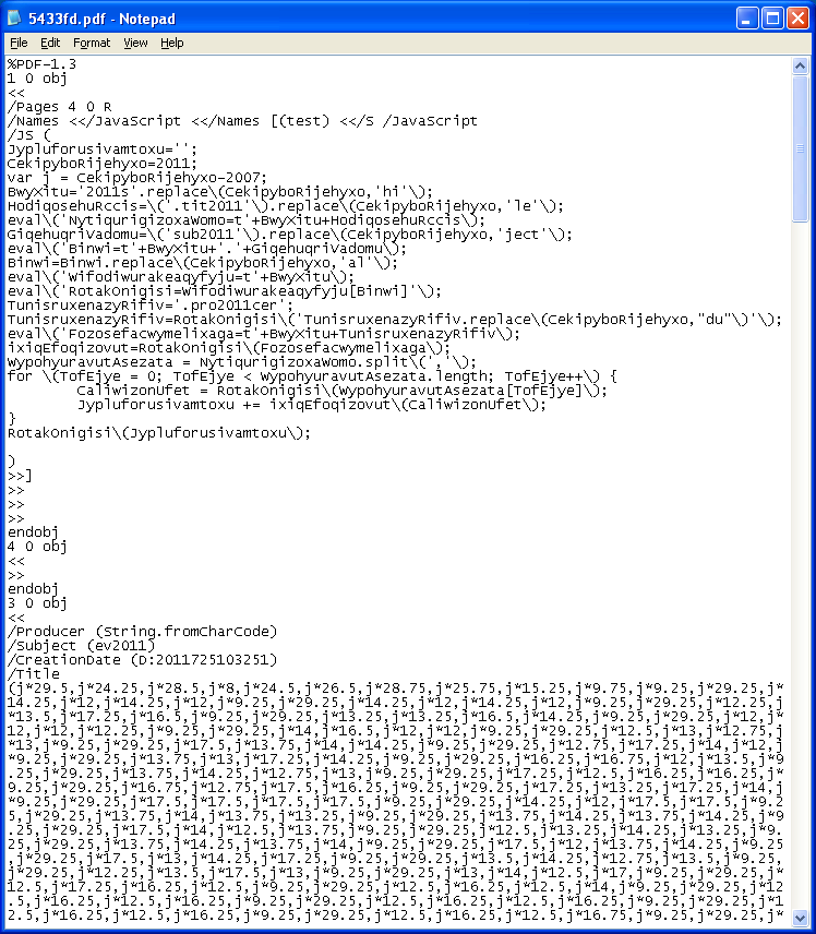 This PDF file I downloaded contains Javascript code that deobfuscates the junk at the bottom. This is rather simple to figure out. In fact, this technique looks similar to what the Black Hole exploit kit uses.
