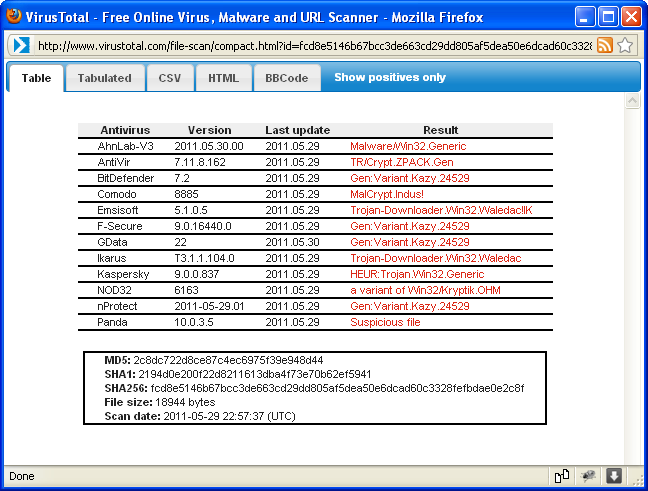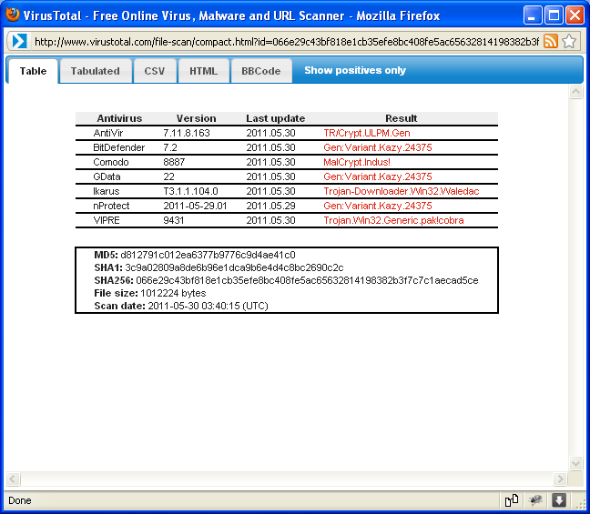 Here’s the link: http://www.virustotal.com/file-scan/report.html?id=fcd8e5146b67bcc3de663cd29dd805af5dea50e6dcad60c3328fefbdae0e2c8f-1306709857#