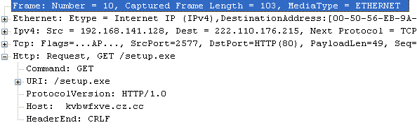 Since it’s likely to be a downloader, I fire up my packet sniffer and run the program. This program downloads a file also called “setup.exe”.