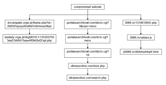 The third set of URLs lead to some kind of search redirection scam which pales next to the drive-bys. Anyway, here’s a summary of the malicious HTTP requests.