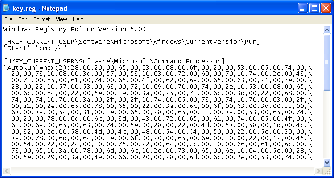 The file sets up an expandable string key called “AutoRun” in HKCU\Software\Microsoft\Command Processor with the following: