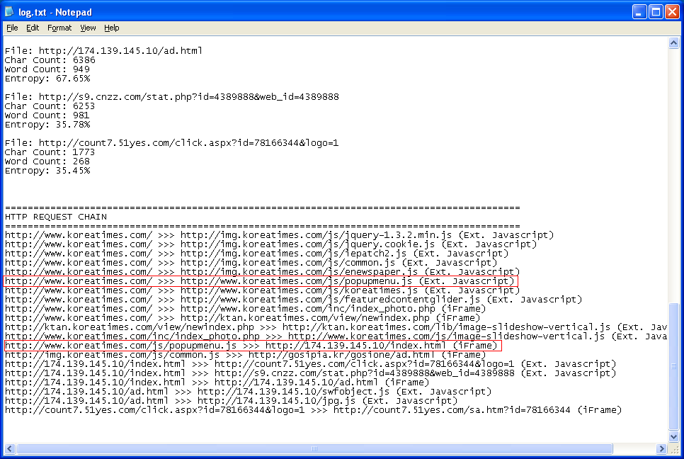 A Korean news site was recently observed distributing malware. I thought it would be an opportune time to test out my program that attempts to locate malicious scripts on a website. Here’s an excerpt from the results:
