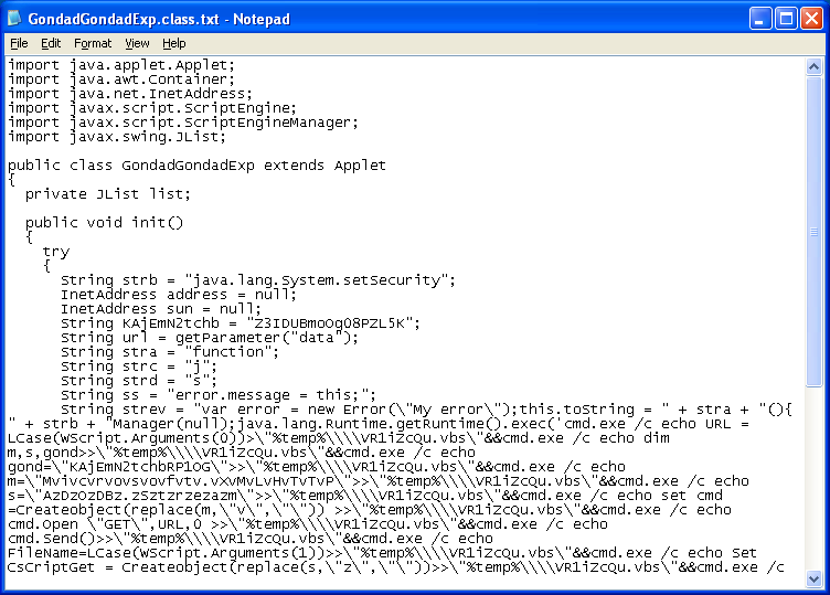 Let’s take a look at the last one since no AV could detect it. This JAR abuses the Rhino Script Engine but unlike other Rhino JARs I’ve encountered before, this one is different in that it writes out and executes a VB Script.