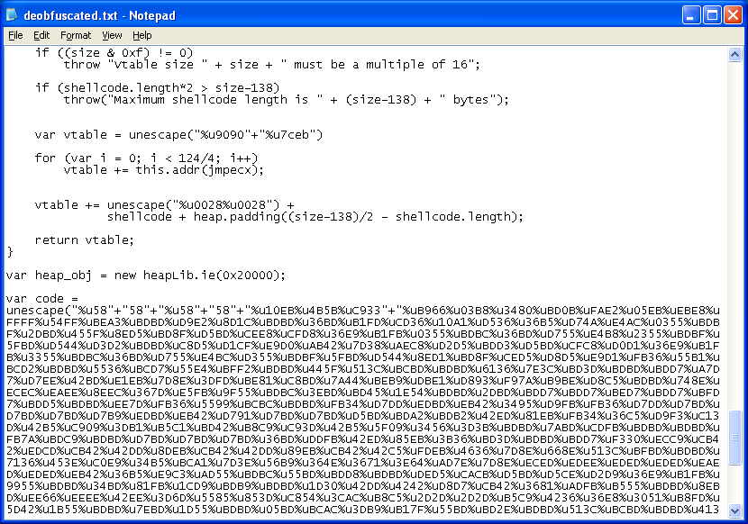 The last exploit in its arsenal, exploits the Microsoft XML Core Services vulnerability. The deobfuscated script looks like something Metasploit puts out.