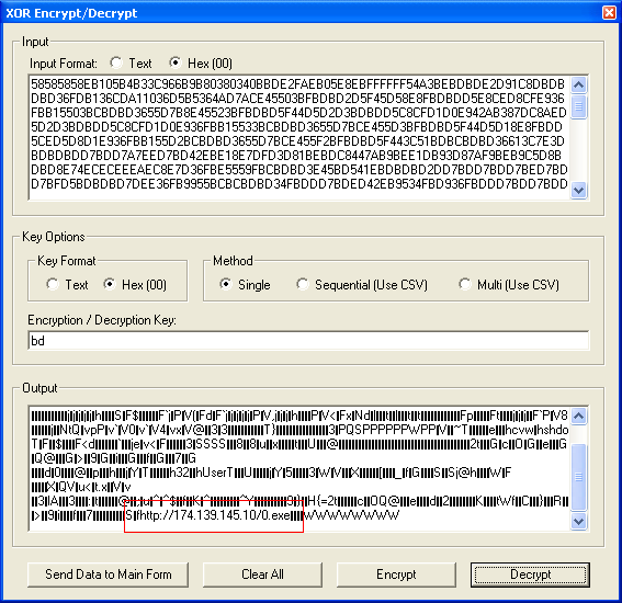 Here’s the shellcode which is XOR’d using 0xBD. The shellcode downloads and executes a file called “0.exe”.