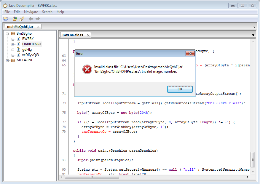 Most of the code in the Java applet is readable so we can see that it is exploiting the latest vulnerability. But as luck would have it, JD-GUI can’t open an important class file. The underlying code indicates that this class file has been XOR’d with 0x0A.