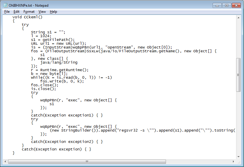 So let’s go ahead and do that. We can now see the contents of this class file which takes in a URL input, writes out the incoming data to a file, then executes it (or registers it as a DLL).
